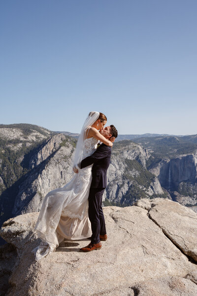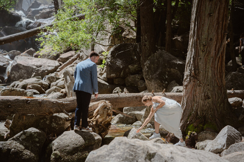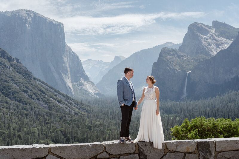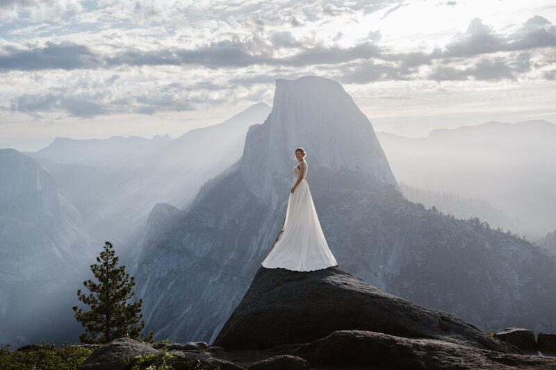 Flowy fabrics look incredible against Yosemite’s cliffs and catch the light beautifully. Avoid heavy ballgowns that are hard to move in. Two brands I love are Rue de Seine and Flora Lane.
